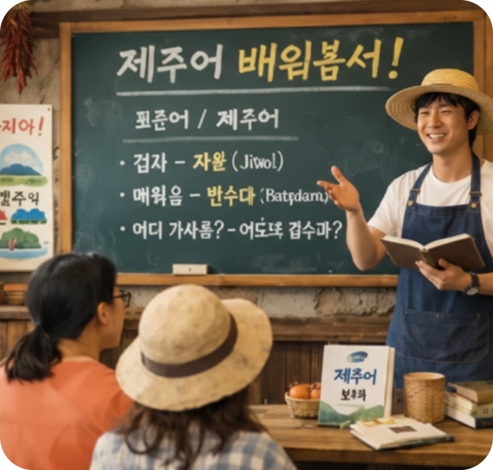제주 여행의 재미를 두 배로 더해줄 '제주 방언 배우기' 시간입니다. 낯설지만 정겨운 제주의 언어를 퀴즈로 쉽고 재미있게 익혀보세요. 일상적인 인사말부터 실전 여행 용어까지, 퀴즈를 풀다 보면 어느새 제주의 문화와 한 걸음 더 가까워집니다.